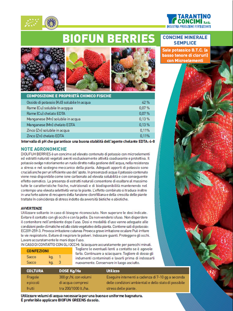 BIOUFUH BERRIES è un concime ad elevato contenuto di potassio con microelementi ed estratti naturali vegetali aventi esclusivamente attività coadiuvante e protettiva. Il potassio svolge notoriamente un ruolo diretto nella gestione dell'acqua, nella resistenza a stress e nel sostegno meccanico della pianta. Adeguati apporti di potassio sono cruciali anche per un'efficiente uso del 'azoto. In presenza di acqua il potassio contenuto viene reso disponibile come ione carbonato ad elevata solubilità e con conseguente effetto osmotico. La presenza di estratti naturali consentono di esaltare al massimo tutte le caratteristiche fisiche, nutrizionali e di bio-disponibilità mantenendo nel contempo una elevata selettività verso le piante. L’effetto combinato si traduce inoltre in una forte azione di recupero della funzione clorofilliana e della crescita delle piante trattate In coincidenza di stress indotto da avversità biotiche e abiotiche.