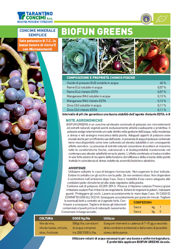 BIOFUN GREENS è un concime ad elevato contenuto di potassio con microelementi ed estratti naturali vegetali aventi esclusivamente attività coadiuvante e protettiva. Il potassio svolge notoriamente un ruolo diretto nella gestione dell'acqua, nella resistenza a stress e nel sostegno meccanico della pianta. Adeguati apporti di potassio sono cruciali anche per un'efficiente uso dell'azoto. In presenza di acqua il potassio contenuto viene reso disponibile come ione carbonato ad elevata solubilità e con conseguente effetto osmotico. La presenza di estratti naturali consentono di esaltare al massimo tutte le caratteristiche fisiche, nutrizionali e di bio-disponibilità mantenendo nel contempo una elevata selettività verso le piante. L'effetto combinato si traduce inoltre in una forte azione di recupero della funzione clorofilliana e della crescita delle piante trattale In coincidenza di stress indotto da avversità biotiche e abiotiche.